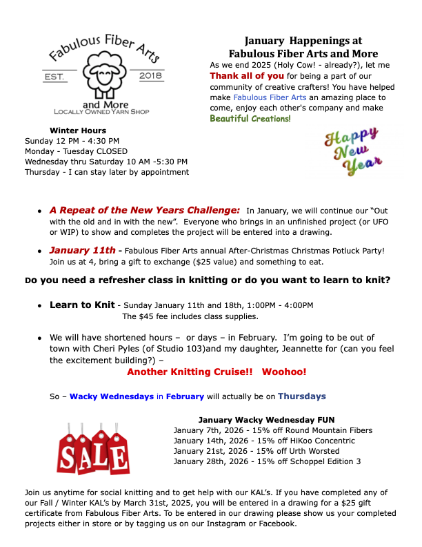 We are excited to offer this hand-dyed yarn and pattern club and provide you with exclusive designs from Fabulous Fiber Arts and More! This year the club’s cost is $41.95 each or $80.95 if you join both clubs.